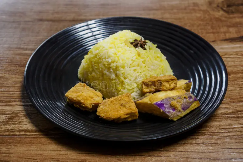 Nasi minyak, meaning “oil rice,” is traditionally served at Malay weddings. It’s cooked with ghee, cardamom, clove, star anise, and pandan, creating an intensely fragrant dish. Often served with ayam masak merah (spicy red chicken).